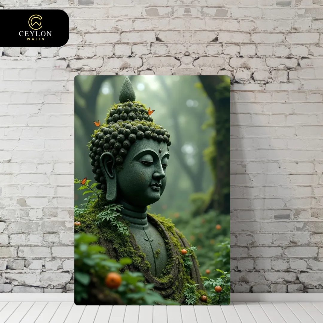 Capture the beauty of impermanence with this Ancient Mossy Jungle Buddha. The nature-reclaimed look adds an element of ancient mystery. Unique canvas wall art for nature lovers.