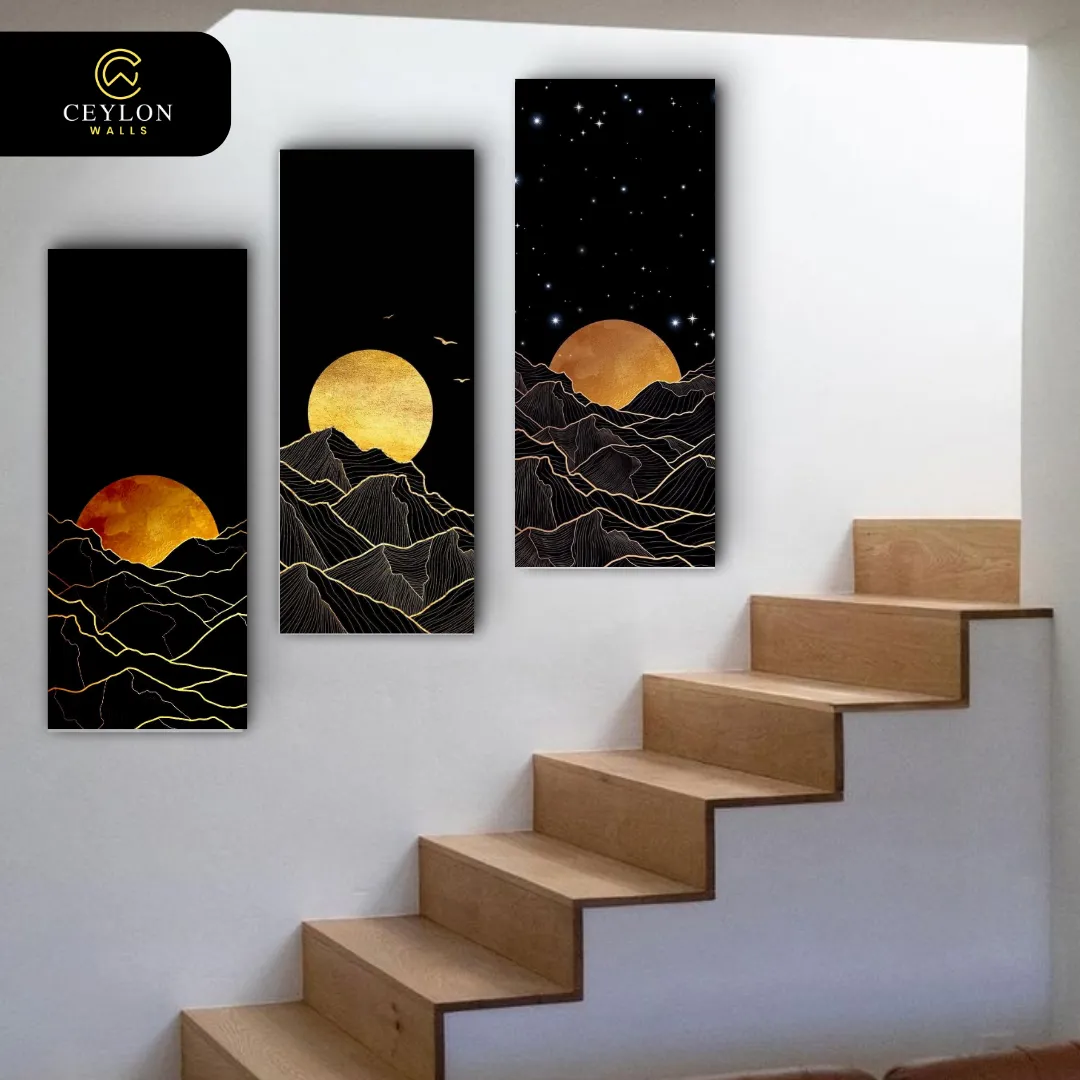 Add a touch of geometric elegance with this Black & Gold Mountain set. The clean lines and metallic gold effect offer a modern, architectural feel. Shop this unique design in our wall arts collection to upgrade your home decor.