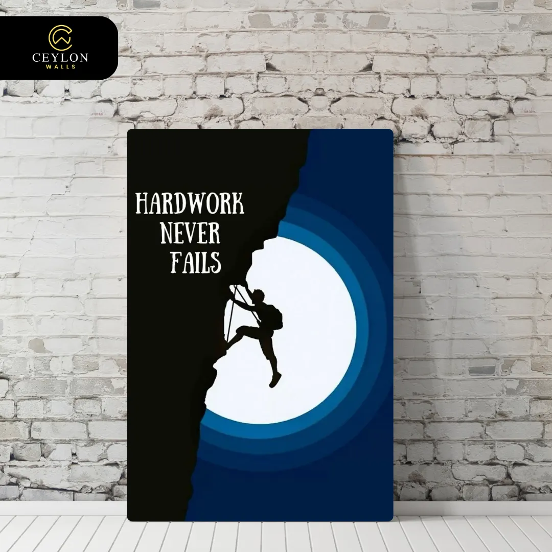 A dramatic silhouette of a rock climber against a dark background with “Hardwork Never Fails”.