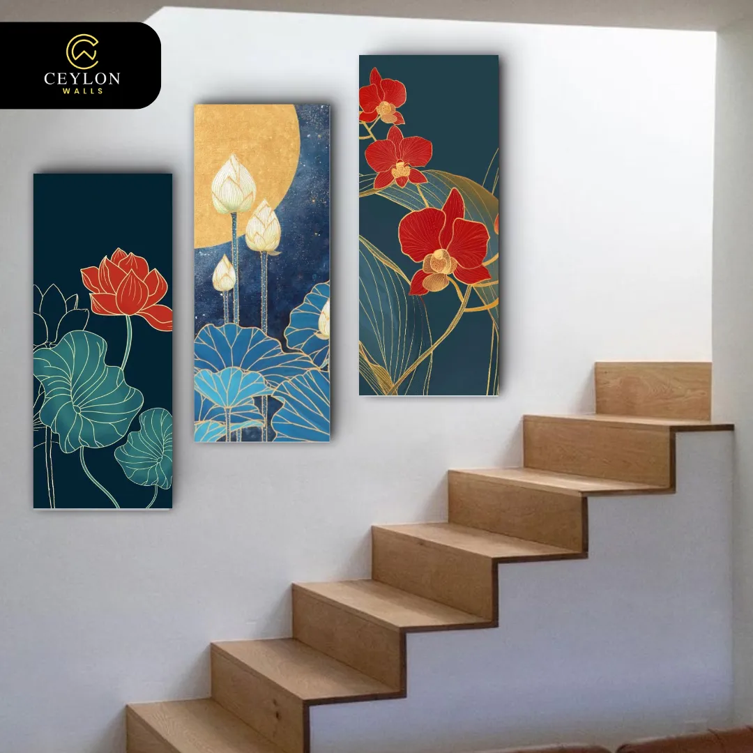 Add a touch of Zen elegance with this Midnight Blue Lotus set. The rich blue tones and traditional floral art style bring sophistication to any space. A timeless choice in our wall arts collection.