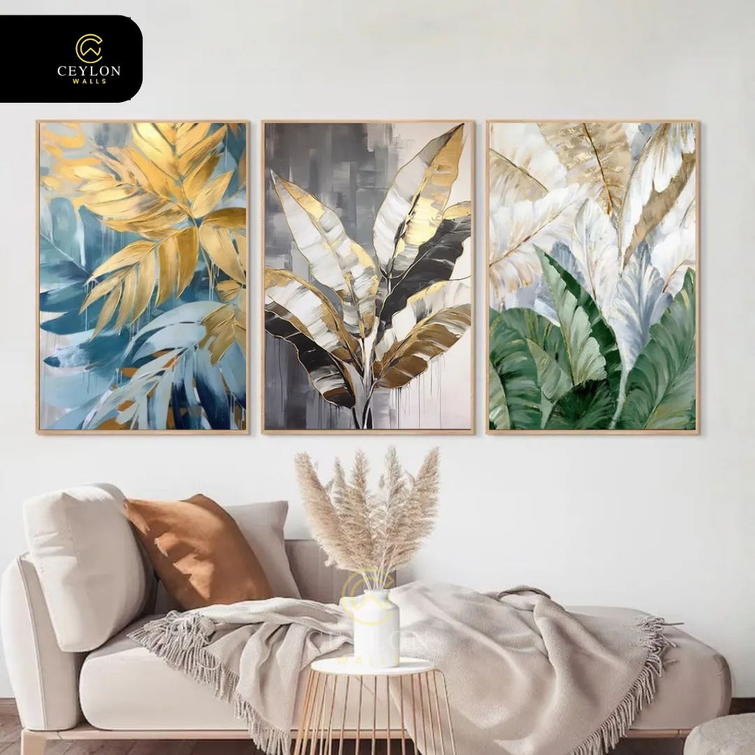 Bring the beauty of nature indoors with this stunning wall art collection. Featuring a high-contrast palette of deep greens and shimmering gold accents, it is designed to breathe life into minimalist spaces. As a leading provider of wall arts Sri Lanka, we ensure this triptych is crafted with durable, fade-resistant materials.